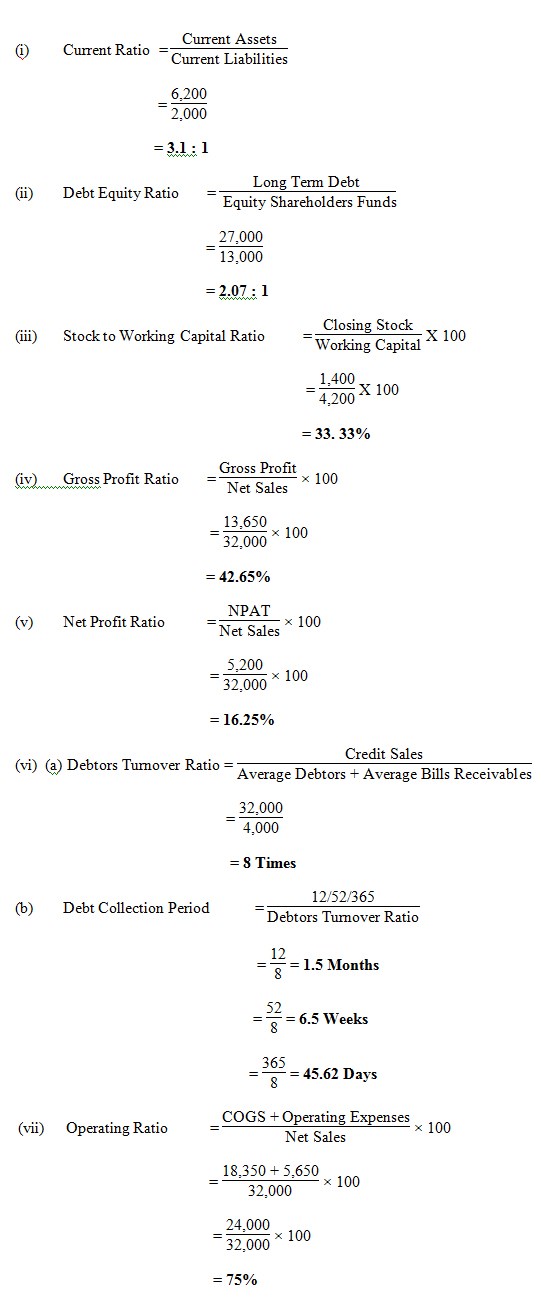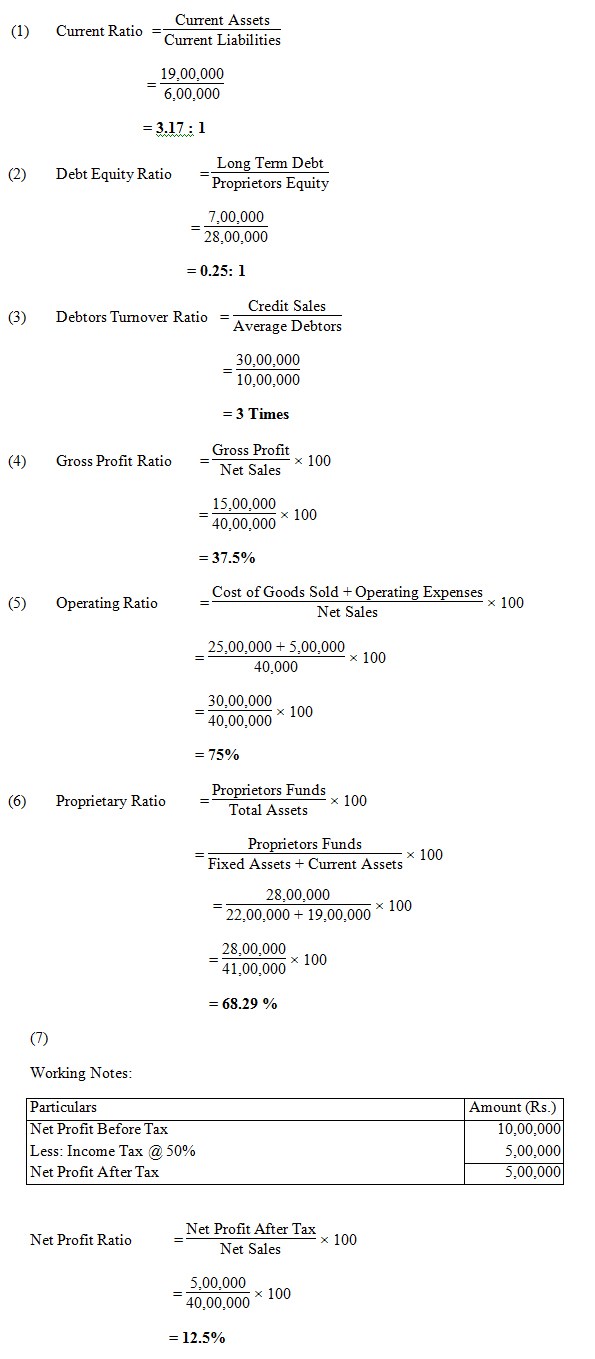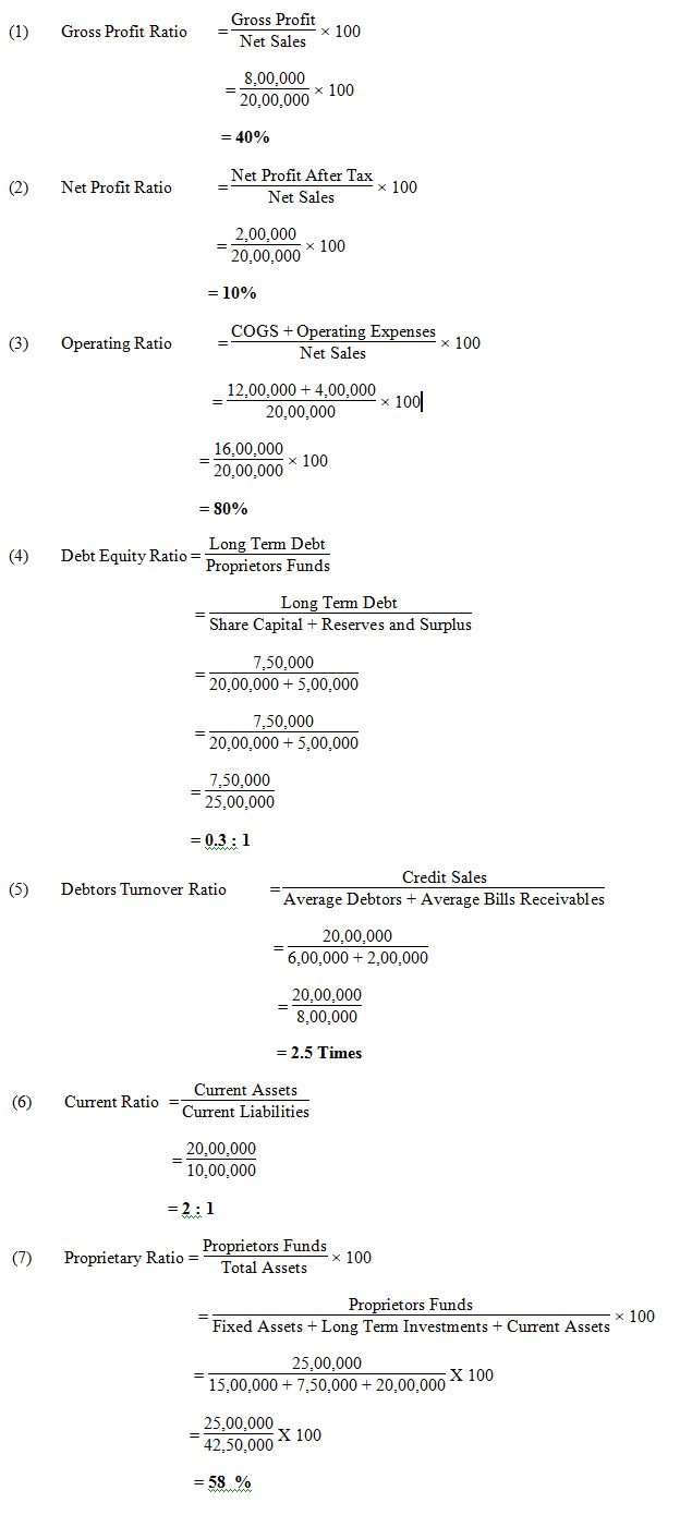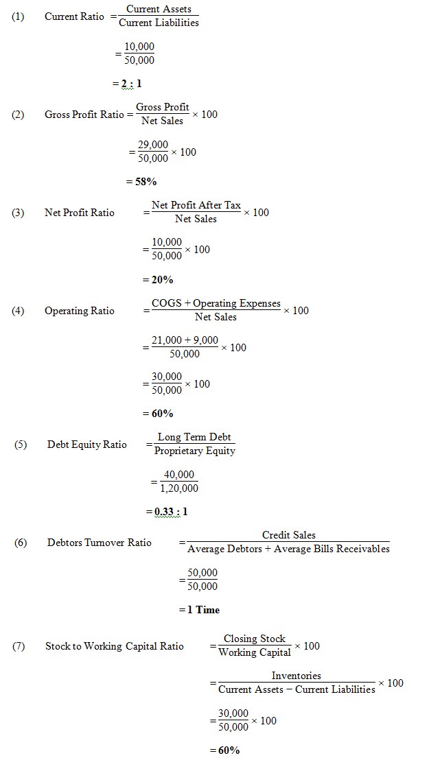 (1) Current Ratio (2) Gross Profit Ratio (3) Net Profit Ratio (4) Operating Ratio (5) Debt Equity Ratio (6) Debtor’s Turnover Ratio (7) Stock to Working Capital Ratio.