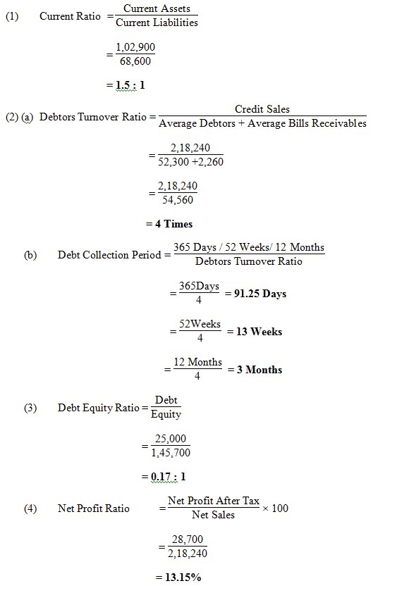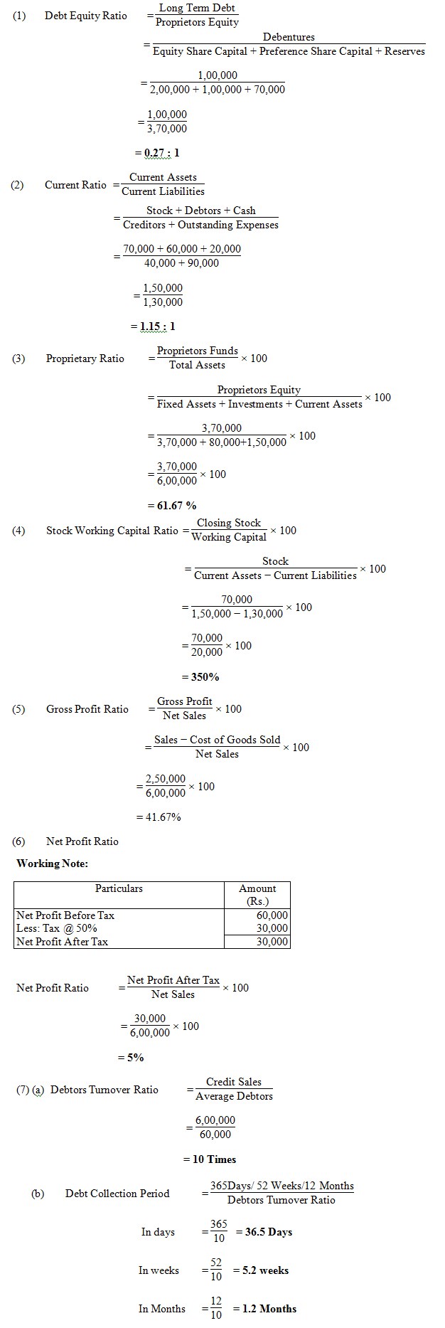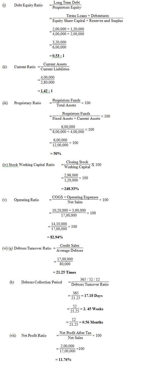 (1) Debt Equity Ratio, (2) Current Ratio, (3) Proprietary Ratio, (4) Stock Working Capital Ratio, (5) Gross Profit Ratio, (6) Net Profit Ratio, (7) Debtors Turnover Ratio and Collection Period.