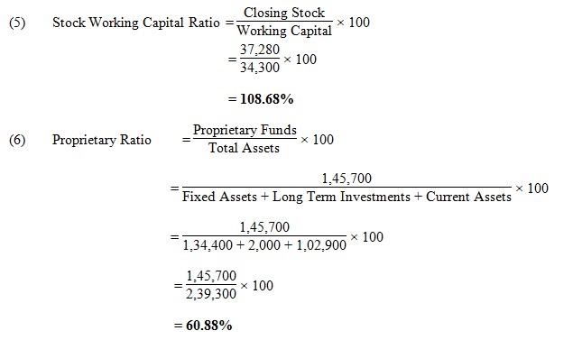 (1) Current Ratio, (2) Debtors Turnover Ratio and Collection Period, (3) Debt Equity Ratio, (4) Net Profit Ratio, (5) Stock Working Capital Ratio, (6) Proprietary Ratio.