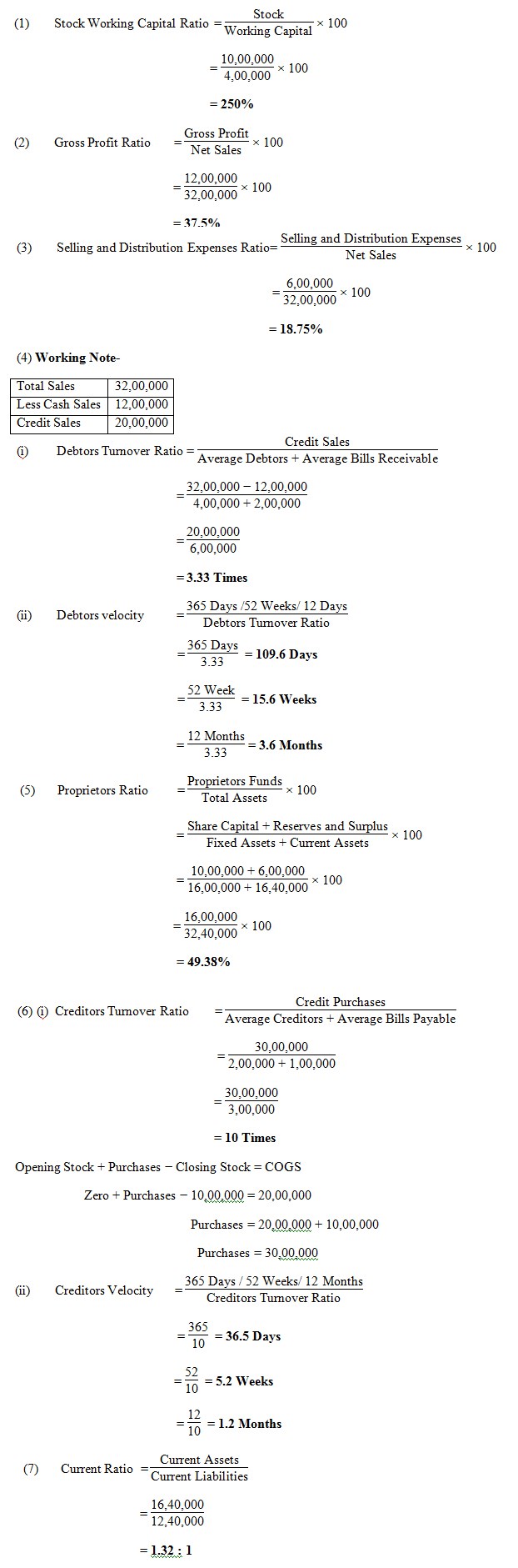 (1) Stock-Working Capital Ratio, (2) Gross Profit Ratio, (3) Selling and Distribution Ratio, (4) Debtors Turnover Ratio and Debtors’ Velocity, (5) Proprietary Ratio, (6) Creditors Turnover Ratio and Creditors’ Velocity, (7) Current Ratio.