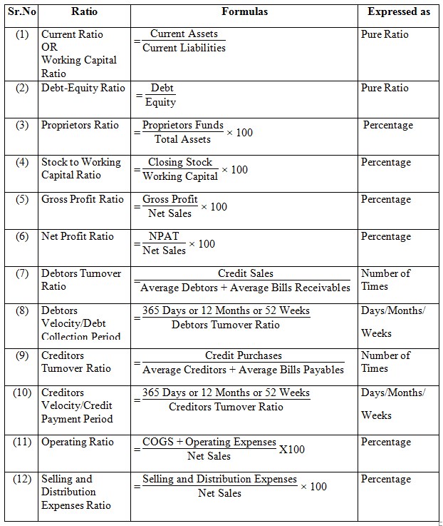 (1) Current Ratio. (2) Debt-Equity Ratio. (3) Debtors Turnover Ratio. (4) Gross Profit Ratio. (5) Operating Ratio. (6) Proprietary Ratio. (7) Net Profit Ratio.